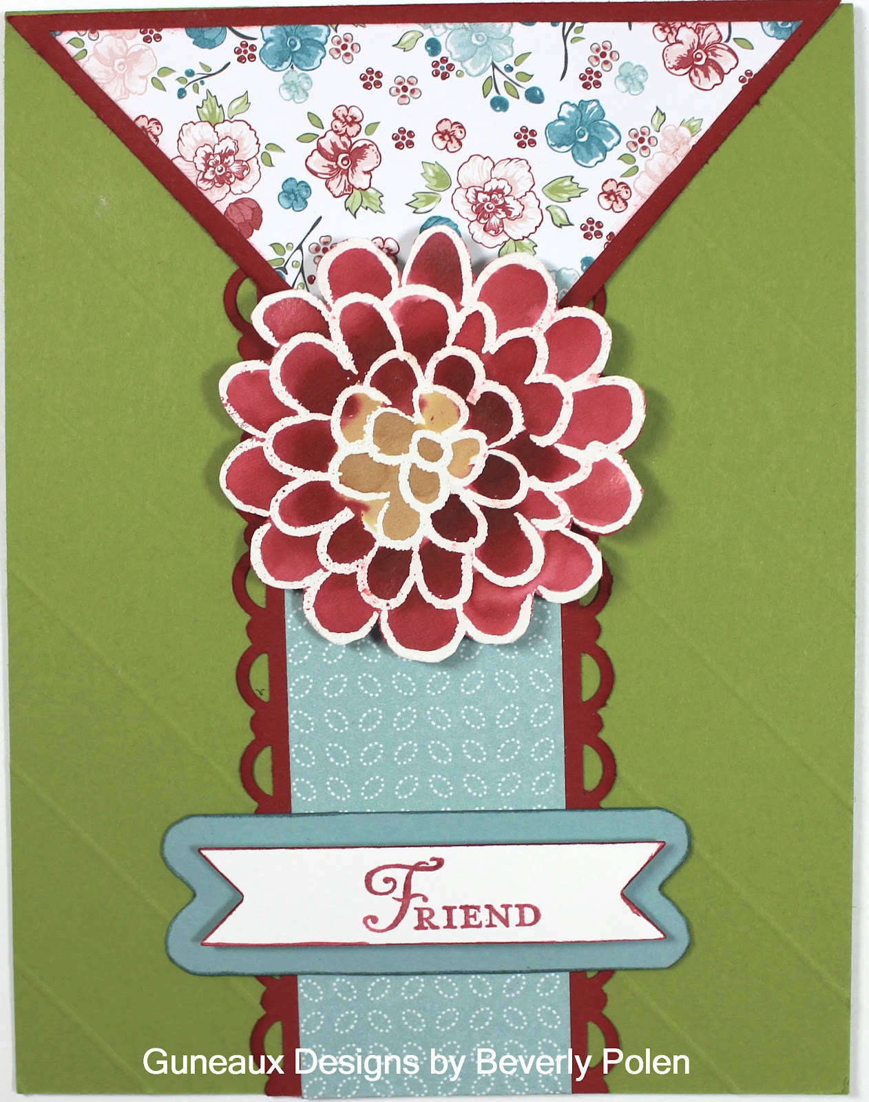 The card base is 4-1/4″ x 5-1/2″ that opens from the bottom.  It is made with Lucky Limeade Card StockHopefully you can see the diagonal lines I created on it with the Stampin’ Up! Simply Scored Diagonal Plate for the Simply Scored Scoring Tool.